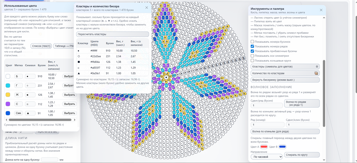 Я продолжаю рассказывать о своей программе для вязания с бисером. В прошлой части показывала, как настраиваю сетку, клинья, симметрию и палитры, а также как превращаю картинки в круговые схемы. Теперь — про «цифровую кухню» внутри: как программа считает бисер и вес, формирует легенду по цветам, генерирует наборный ряд и чек‑листы, а также сохраняет и экспортирует проекты для печати и мастер‑классов.