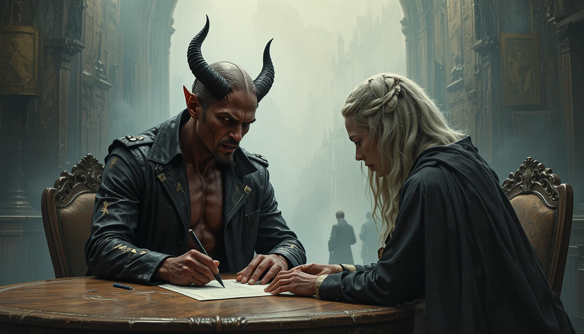Не договором. А поступком. Моментом, когда ты выбираешь зло вместо добра, обман вместо истины, удовольствие вместо ответственности. Каждый такой выбор — это подпись под векселем. Когда выборов становится много, ты больше не можешь свернуть.