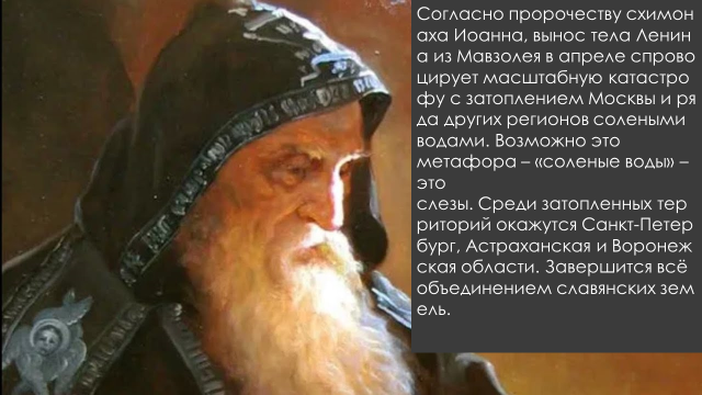 u Согласно пророчеству схимонаха Иоанна, вынос тела Ленина из Мавзолея в апреле спровоцирует масштабную катастрофу с затоплением Москвы и ряда других регионов соленными водами . Среди затопленных территорий окажутся Санкт‑Петербург, Астраханская и Воронежская области. Может быть «соленные воды» метафора – это слезы. Завершится всё объединением славянских земель.