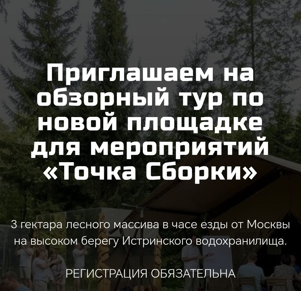 #Московскаяобласть #офлайн 🗣 Презентация площадки "Точка сборки"🗣 Все мероприятия недели (с 20.04 по 26.04.2026) доступны по хештегу: #20апр_26апр26 ⏰ 12:00 📍 Территориальное управление Соколовское городской округ Солнечногорск ❗️ Регистрация Приглашаем на Истру. Покажем новую площадку «Точка сборки» — как она работает вживую, а не на слайдах. Это «стадион тимбилдинга»: пространство, сценарии, реквизит и природа — всё работает на команду. 23 апреля | сбор в 12:00 Что будет: — диджей, фуршет, знакомство с территорией (3 га, лес, арт-объекты, шатры, множество тематических зон) — коротко про концепцию, форматы, цены и условия — дальше — смотрим и пробуем: • чум с костром, юрта, гамаки • авторские упражнения и испытания • вода: каноэ, байдарки, катамараны (если позволит погода - покатаемся) • тиры, актив, реквизит После — пикник: мясо, вино, баран, чача. Финал — костёр, музыка, баня, живое общение. Мы много лет делаем сильные командные программы — теперь показываем, как это ус