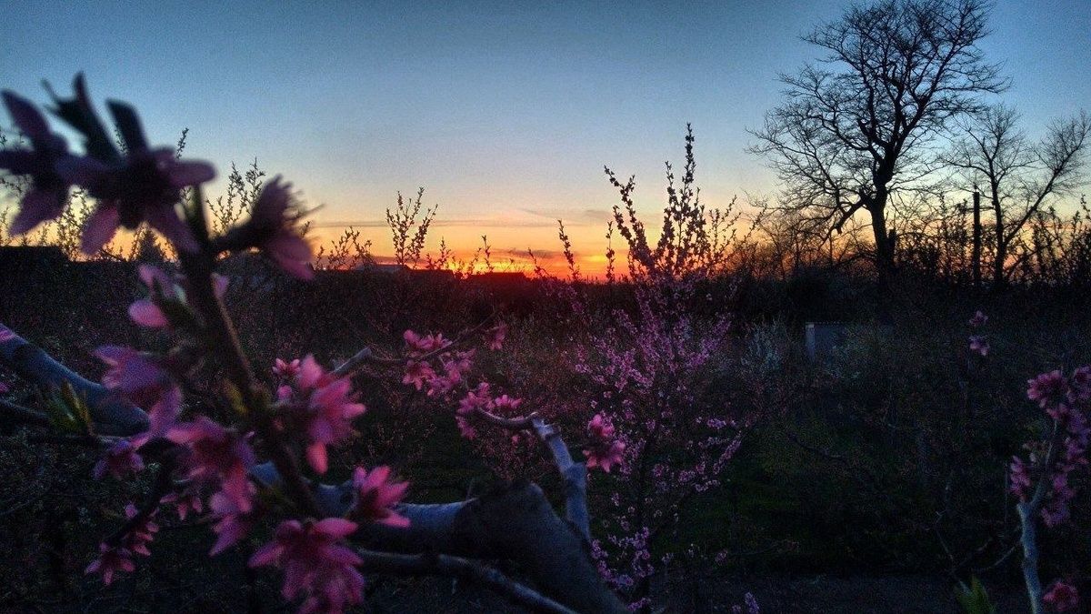 Полоса заката горела ровно до 8 вечера 🔥 подсвечивая цветущий сад. Благодатный огонь 🔥сошел,
