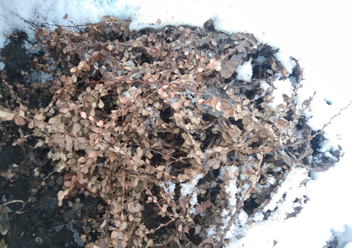 В моём случае, я понимаю, что причины, почему кустарники в листве уходят под снег, это погодные условия. Прошлой осенью у меня всё было в листве и даже березы скидывали зелёные лепестки, уже после мороза, когда лежал снег, холодно, листья просто засохли и от ветра облетели, не окрасившись в жёлтый цвет.