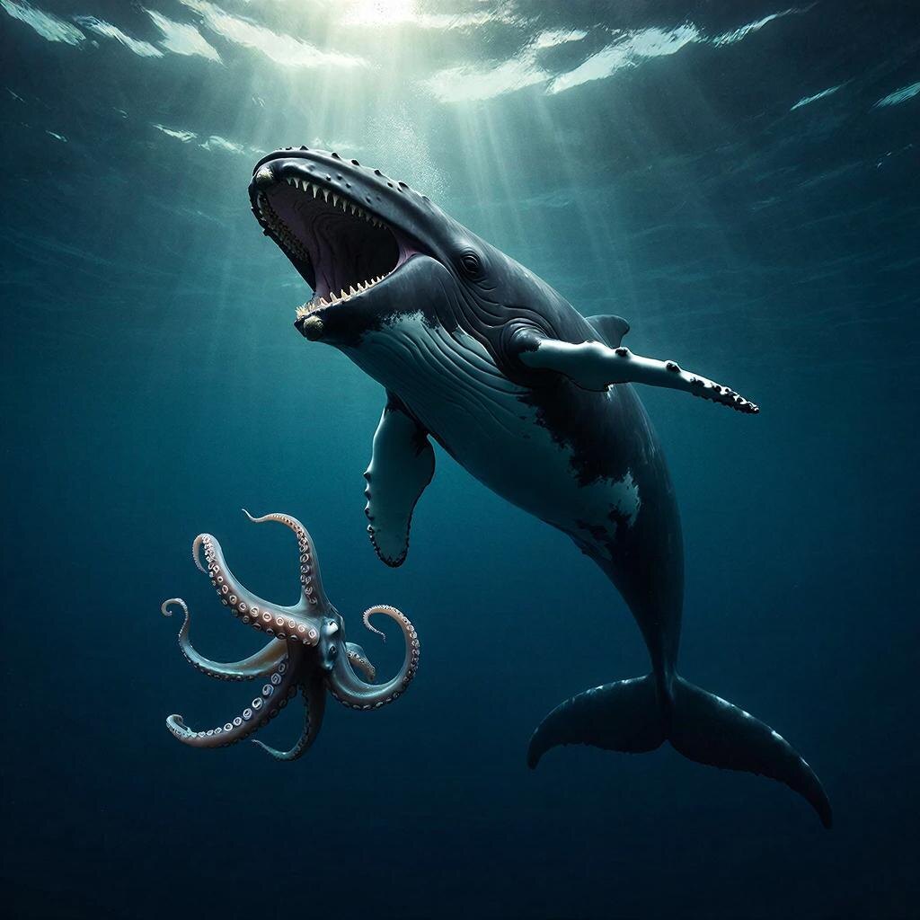 Ну что, друзья, приготовьтесь. Сейчас будет немного страшно. Мы привыкли, что в океане главный хищник — это акула с её зубами. Или косатка с её стаей. Но есть одно животное, которое не пользуется ни челюстями, ни когтями. Оно использует читерское оружие — звук. Встречайте: кашалот. Увалень с квадратной головой, который ест гигантских кальмаров на глубине 2 километра. Но как? Кальмар больше него, с клювом как кусачки, и живёт в полной темноте. А кашалот... у него даже зубов нормальных нет на верхней челюсти. Секрет в том, что он кричит добычу до смерти. Буквально взрывает её изнутри. Представьте себе подводную лодку, которая вместо торпед стреляет... щелчками. В огромной голове кашалота (она занимает треть тела!) находится сложнейший орган — спермацетовый мешок и две «жировые линзы». Кит щёлкает носом, и этот щелчок фокусируется в луч, как лазер. Цифры для понимания: Но это не просто громко. Это оружие направленного действия. Допустим, кашалот нашёл кальмара. Он не гонится за ним (кальм