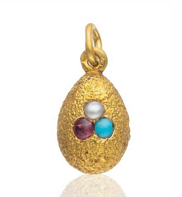 Итак, в канун светлого праздника Пасхи, ставшая уже традиционной подборка украшений в виде пасхального яйца от фирмы Карла Фаберже. Чаще всего это были кулоны, но фирма создавала и броши, и даже запонки к этому почитаемому весеннему празднику. Чаще всего кулоны дарили девочкам. К восемнадцати годам девушка, ежегодно получавшая такой подарок, уже имела солидную коллекцию подвесок, которые иногда собирали на цепочку в виде ожерелья. Размер почти всех таких кулонов около 2 см. Миниатюрное золотое яйцо с бирюзой, рубином и жемчугом, фирма Фаберже, Санкт-Петербург, до 1899 г. Золотая брошь с подвеской в виде яйца с сиреневой гильошированной эмалью инкрустированная бриллиантами, мастер Хенрик Вигстрём фирма Фаберже, Санкт-Петербург, 1908-1917 гг. Кулон-яйцо из бовенита в золотой оправе с красной эмалью и сапфиром, фирма Фаберже, Санкт-Петербург, около 1900 г., из коллекции британских монархов. Золотой кулон-яйцо с бирюзой и бриллиантами, мастер Альфред Тилеман, фирма Фаберже, Санкт-Петербург