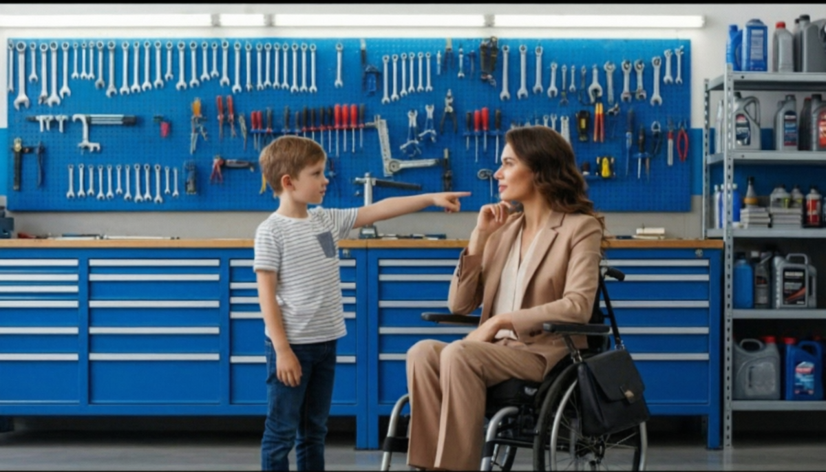 Мастерская внутри оказалась именно такой, как ожидалось: запах масла, инструменты на стенах, грязный пол. И — что неожиданно — мальчик. Лет пяти-шести, в полосатой футболке, с любопытными глазами, которые разглядывали её без стеснения.