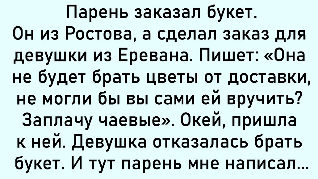 Парень заказал букет. Он из Ростова, а сделал заказ для девушки из Еревана. Пишет: «Она не будет брать цветы от доставки, не могли бы вы сами ей вручить? Заплачу чаевые». Окей, пришла к ней. Девушка отказалась брать букет. И тут парень мне написал: «Ничего, оставьте себе». Я разделила этот огромный букет и прикрепила записки от его имени с его аккаунтом. Вышла вечером на центральную улицу Еревана и дарила всем девушкам и говорила напишите парню приятные слова! Мораль: если не обрадовал одну, 17-20 девушек больше получили порцию счастья! © stepanyan.zhanna