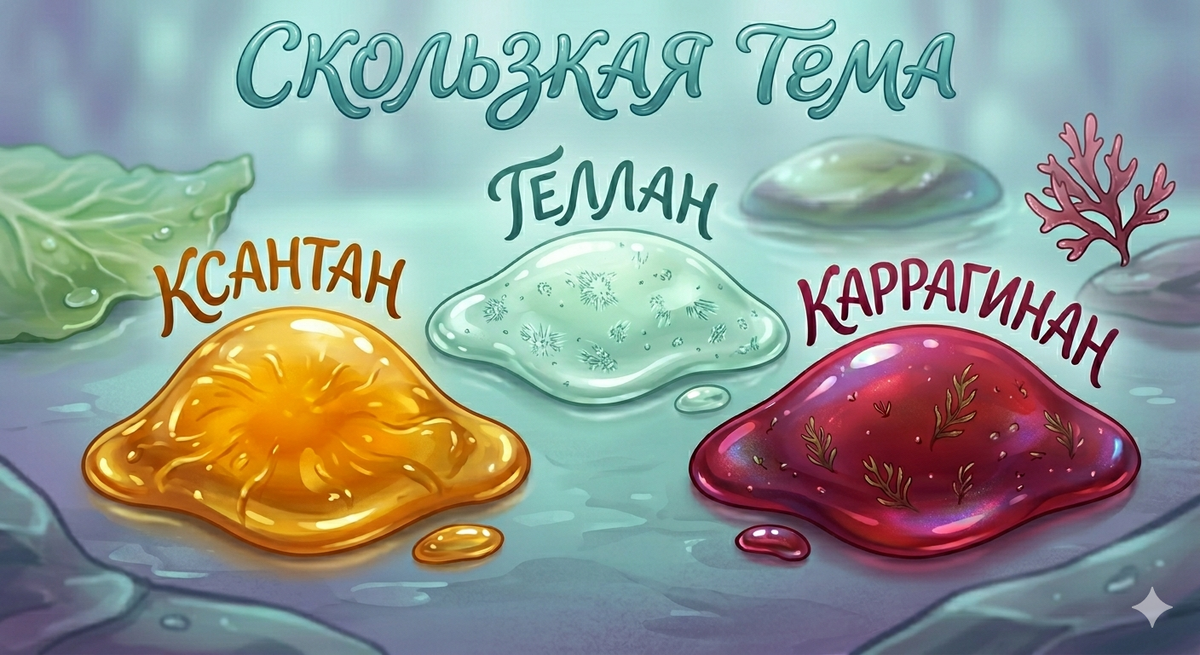 Знакомьтесь, причины этих явлений: ксантан (=ксантановая камедь), геллан (=геллановая камедь) и каррагинан (в водорослях может быть не только он, но для примера возьмем его).