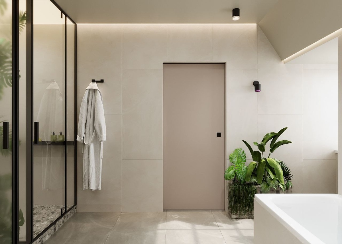Персональная ванная комната является главным функциональным аспектом жилой комнаты. Когда вход в ванну спроектирован из комнаты, то лучше использовать сдвижную дверь. В открытом виде дверное полотно не будет мешать и в таком положении оно будет находиться большую часть времени, так как в нашем пространстве проживает один человек. Проект - #АЧ_Современный_Максимализм