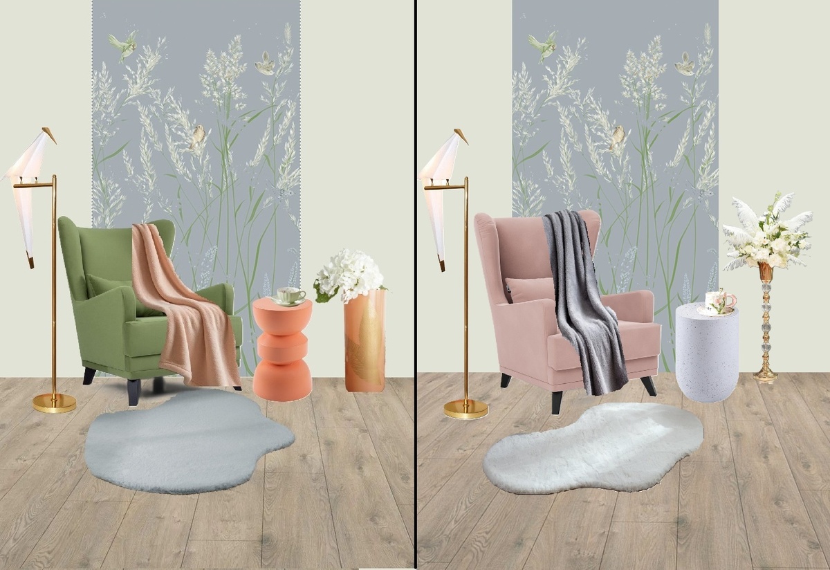 Необычная подборка. Приветствую любителей дизайна и подбора товаров! Сегодня я покажу необычную подборку. Зачастую уже имея готовый интерьер, хочется как-то его дополнить или разнообразить. При этом кто-то предпочитает пастельные оттенки, а кто-то яркие, кому-то нравится тёмная мебель, а кому-то светлая.... 📍Напомню,что все синие слова -ссылки кликабельны На основе фотообоев я подобрала цвет стен (краску можно купить там же фирмы hugge, цвет см. рис.) И уже к этому интерьеру выбрала очень удобное для посадки кресло в оливковом и розовом цветах. Далее журнальный столик в первом варианте я сделала яркий оранжевый (терракот), а во втором уже более лёгкий -белый в крапинку. Ковёр также одинаковый по форме, однако серо-голубой оттенок ,подходящий в стенам слева и справа белый. Пока в маленьком размере они "скоро будут", они есть и большие. Детали - конечно, большинство деталей на маркетплейсах, поэтому всегда можно подобрать похожее или дешевле в другом (озон, вб). И далее переходим