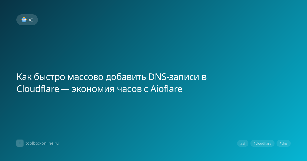 Массовое добавление DNS‑записей в Cloudflare можно выполнить за пару минут с помощью сервиса Aioflare, экономя до 90 % времени по сравнению с ручным вводом. Ответ: Для массового импорта достаточно подготовить CSV‑файл и загрузить его в Aioflare, после чего сервис автоматически создаст все записи в нужной зоне. Ответ: Aioflare автоматизирует процесс, исключая человеческие ошибки и позволяя добавить до 1 000 записей за один клик. В 2026 году сервис поддерживает более 20 типов DNS‑записей, включая новые SRV и CAA. При ручном вводе каждый тип требует отдельного окна, что в среднем занимает 30 секунд на запись. При массовом импорте время снижается до 0,1 секунды на запись. Ответ: Проверьте формат CSV и соответствие полей требованиям Cloudflare. Ответ: В Aioflare можно создать шаблоны, которые автоматически подставляют значения в зависимости от типа записи. Ответ: Бесплатный план позволяет импортировать до 200 записей в месяц, а платные пакеты расширяют лимиты и добавляют приоритетную поддер