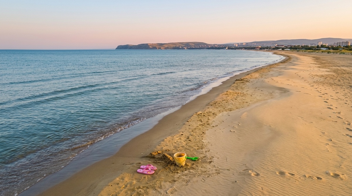 Это двенадцать километров между центром Анапы и Витязево, вдоль одного длинного песчаного пляжа. Именно сюда массово едут с маленькими детьми — море заходит плавно, первые метры мелкие, песок чистый.