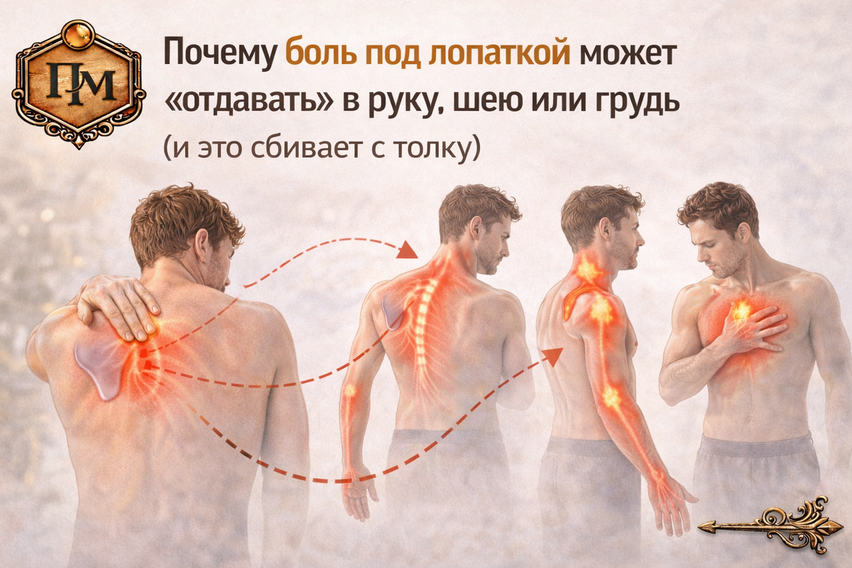 👉 «может, это вообще не мышцы» Но чаще всего причина остаётся той же. 👉 мышцы Это один из самых непонятных моментов. Логично ожидать: 👉 болит там — где проблема Но в теле это работает иначе. 👉 боль может ощущаться не там, где находится её источник Это называется: 👉 отражённая боль В мышцах есть участки, которые называют: 👉 триггерные точки Это зоны напряжения внутри мышцы. И они могут: — давать локальную боль