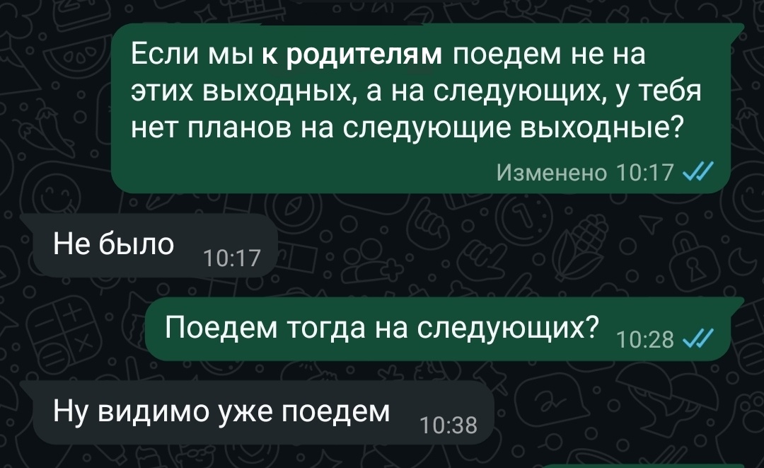 Разберём типичную для многих пар переписку. На первый взгляд — безобидное согласование поездки. Но если копнуть глубже, перед нами идеальная модель отношений, в которых женщина удобно не существует как личность с правом голоса. Она — просто фон, не оказывающий сопротивления.