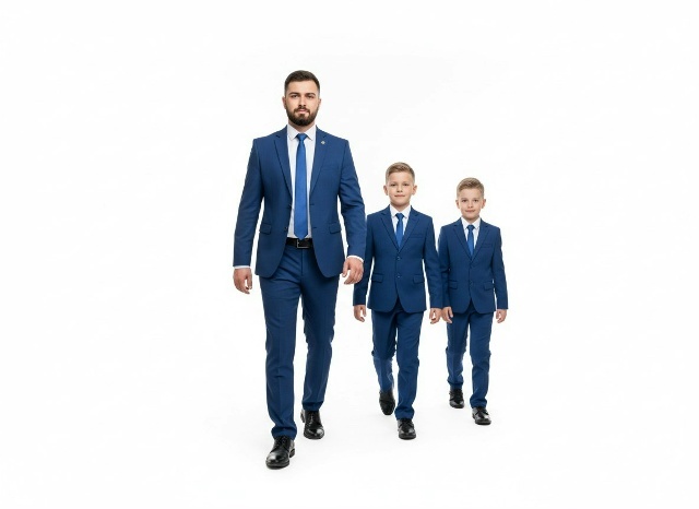 СТРОГО сохранить лицо, кожу, возраст, черты и пропорции 1:1 без любых изменений. Студия на чисто белом фоне, мягкое фронтальное освещение, направленное сверху/слева, минимальные тени. Ракурс фронтальный, полный рост; кадрирование — три фигуры в одной композиции: ведущий мужчина в переднем плане, за ним по диагонали два мальчика в одинаковых синих костюмах, белых рубашках и синем галстуке, обувь черная лакированная. Позы: ходьба к камере, естественные движения. Стиль: фотореализм, кино. Глубина резкости большая, все три фигуры в резкости; фокусное расстояние 50 мм.