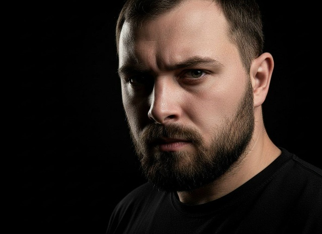 Используй лицо мужчины с загруженного фото. Мужской портрет крупным планом. Резкие черты лица, короткая стрижка, легкая щетина. Одежда — простая черная футболка. Глубокие тени, жесткий боковой свет, черный фон. Акцент на текстуру кожи и взгляд.