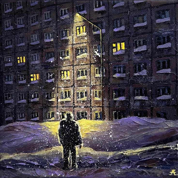 Уже стемнело. Открываются и закрываются двери подъездов. Дяди в высоких косматых шапках достают что-то из багажников своих машин. Дети гуляют с мамами и бабушками, радуясь почти наступившим каникулам, кто-то лепит снеговика, кто-то затеял игру в снежки.