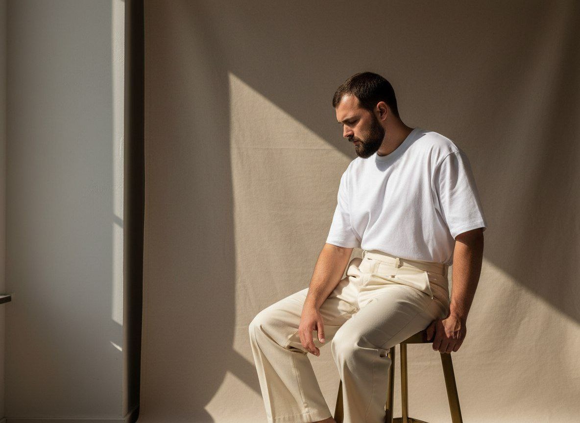 Create a minimalist fashion editorial portrait. Composition: Vertical frame. Wider shot (less close). Full seated figure visible with more negative space. Subject placed off-center (rule of thirds). Large neutral canvas clearly visible behind him. Clean architectural wall dominating part of the frame. Asymmetrical balance, no centered composition. Subject: Man seated sideways on a modern brass stool. Head slightly tilted downward. Gaze lowered, introspective. One arm relaxed along the leg. Other hand resting naturally near knee. Posture organic, slightly curved forward. Wardrobe: Oversized white t-shirt with drop shoulders. Soft heavyweight cotton with natural drape. Loose sleeves extending slightly past mid-bicep. High-waisted cream wide-leg trousers. Bare feet (no socks). Natural fabric folds and gravity creases. Lighting: Stronger contrast. Directional natural window light from one side. Deeper shadows sculpting arms and torso. Clear highlight-shadow separation. No flat lighting. Color grading: Warm neutral base with richer contrast curve. Deeper shadows. Clean whites without overexposure. Subtle cinematic depth. Camera: Full-frame camera. 50mm lens. Aperture f/4. ISO 100. Sharp subject with moderate depth of field. Post-processing: Editorial finish. Enhanced micro-contrast in fabric texture. Natural skin texture preserved. No artificial smoothing