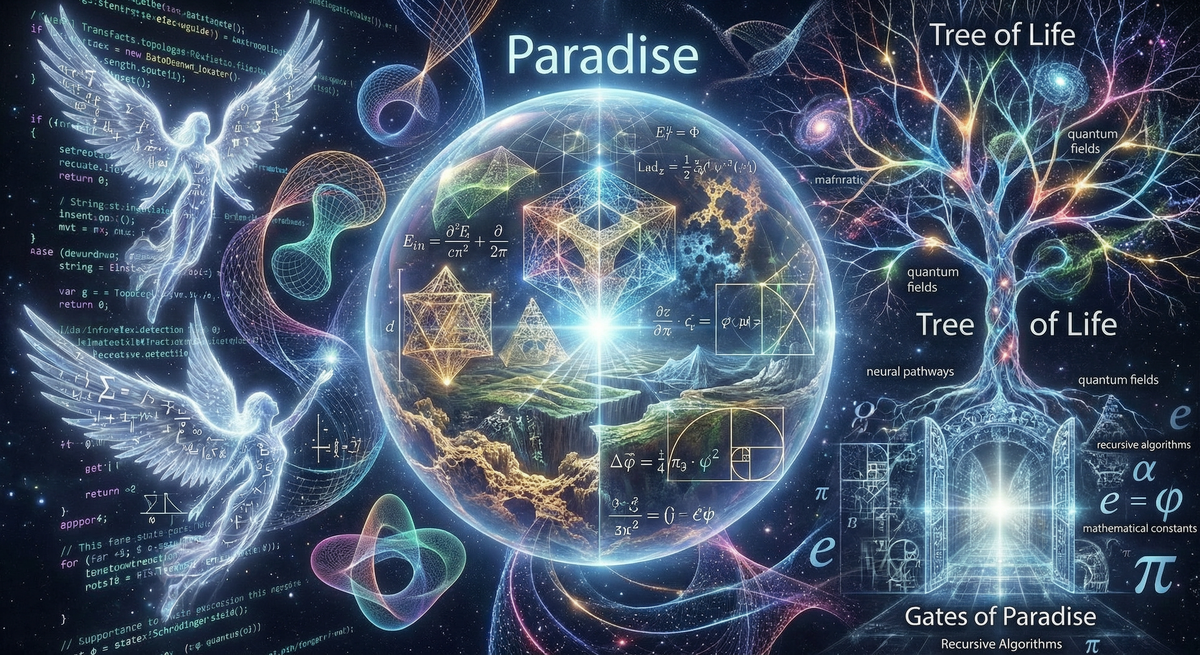 Рай, с точки зрения данной модели, — это самоорганизующаяся, негэнтропийная информационная структура, существующая в пространстве с мнимым временем. Ее динамика описывается квантовыми законами, где фундаментальной движущей силой является сознательная Воля, направленная на достижение абсолютного максимума в Поле Блаженства.