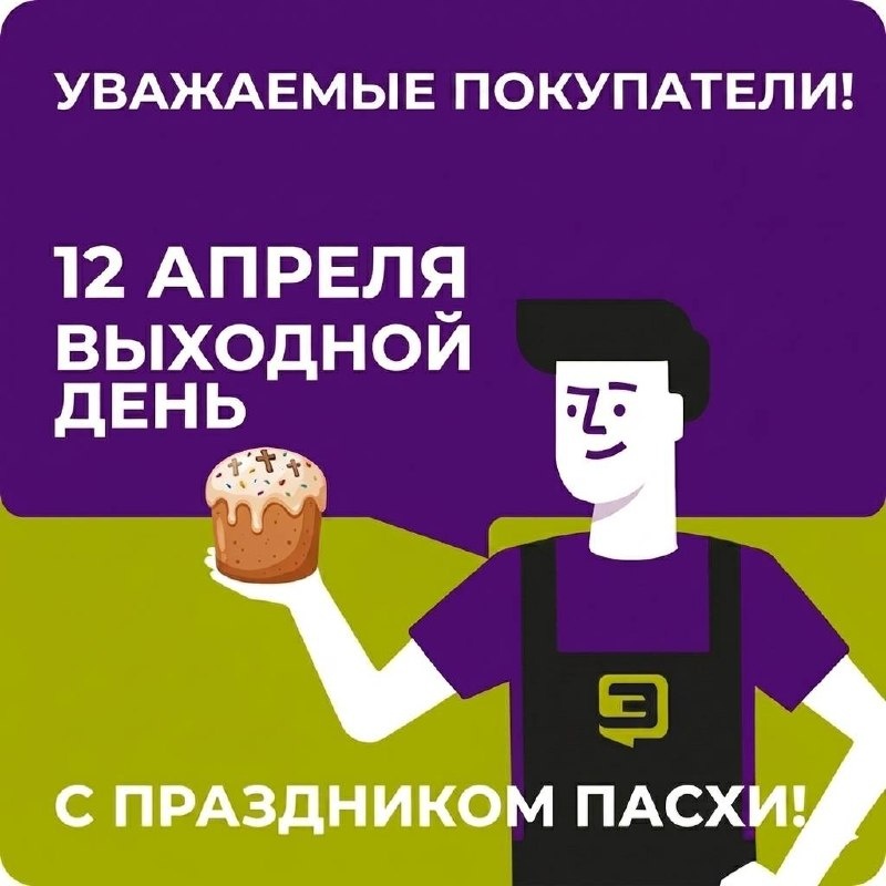 ! 📢 Обратите внимание: 12 апреля — выходной день. Ждем вас за покупками в остальное время! Со светлой Пасхой! 🕊️ Мира, добра и тепла вашему дому. Пусть праздник принесет радость и уют! Христос Воскресе! ✨