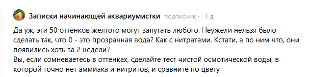 «Вы, если сомневаетесь в оттенках, сделайте тест чистой осмотической воды, в которой точно нет аммиака и нитритов, и сравните по цвету ».