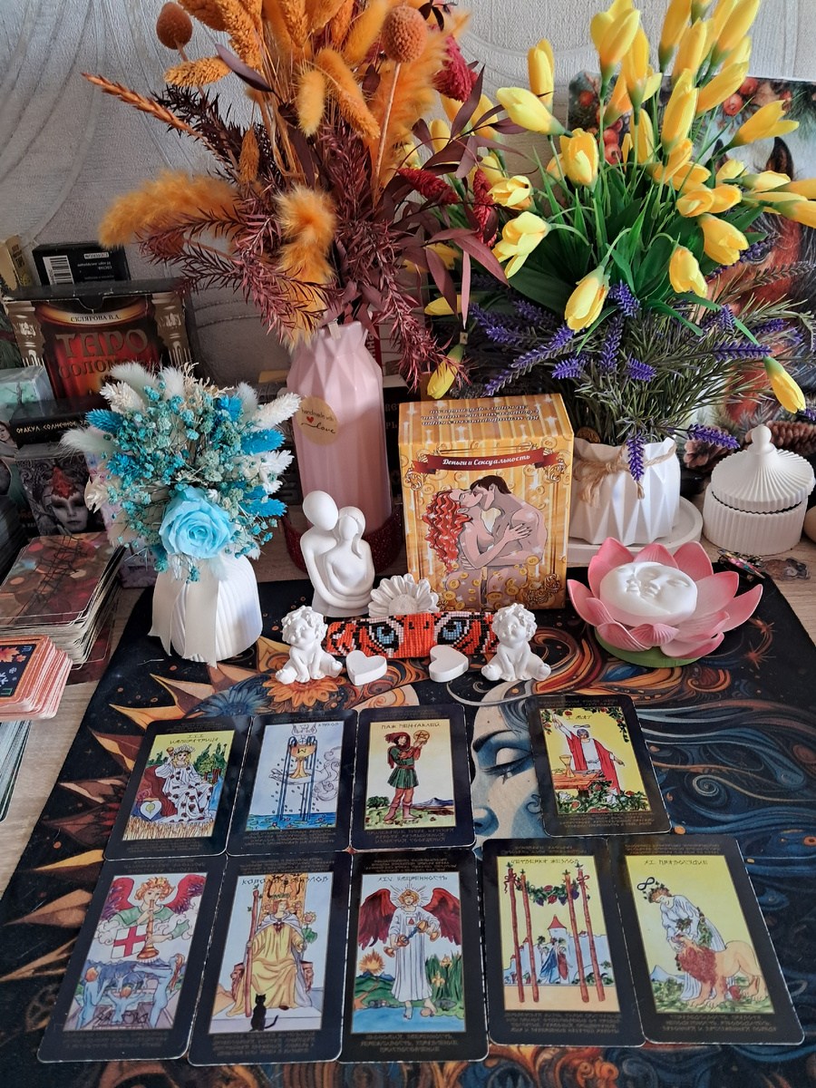 3. Итог: очень позитивный. Отношения приведут к стабильному, тёплому союзу с элементами праздника (4 жезлов). Вы вместе будете творить (Маг) и сохранять нежность (Сила). Скорее всего, речь идёт о долгосрочных отношениях вплоть до брака и создания дома.