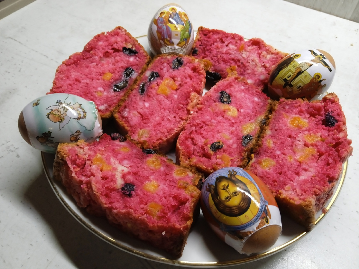 Это очень вкусный рецепт Пасхи ! Вам понадобится : рецепт - продаётся в магазине магнит . к этому набору добавить 70 гр. масло сливочное и 120 мл. молока . сырковая масса 2 штуки - 90 гр. изюм - кис-миш красный продаётся в магазине магнит . абрикос вяленный - очень светлый - продаётся в магазине магнит . Абрикос нарезать мелкими кусочками . Сахар ванильный 20 гр. Смешайте рецепт кекса , масло , молоко , творог , изюм , абрикос , добавьте немного малинового пищевого красителя . Хорошо промешать . Выложить в форму для выпечки с верху посыпать ванильным сахаром , для оформления вкусной корочки . Выпекать 1 час 25 минут ( Пасха большая размером - как хлеб . ) Если вы разделите тесто на две части время выпекания изменится . Желаю приятного аппетита ! Поздравляю Вас всех с праздником Великой Пасхи ! Прошу Вас поделится рецептом и поздравлениями с вашими друзьями в инете . Принимайте участие в голосовании самых вкусных рецептов . Пишите Ваши комментарии ! Мы любим Вас ! Лучших рецептов .
