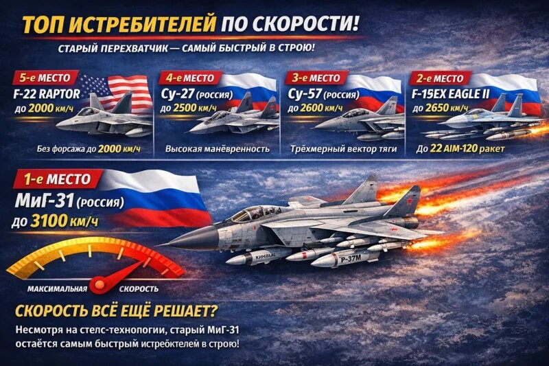 Пока мир увлечён стелс-технологиями и «невидимыми» истребителями, реальность оказалась жёстче — скорость по-прежнему решает. Новый рейтинг самых быстрых боевых самолётов в строю показал неожиданную картину. Современные «невидимки» уступили машинам, чьи корни уходят в эпоху холодной войны. Сегодня воздушные бои строятся вокруг малозаметности, электроники и дальнобойных ракет. Однако высокая стоимость истребителей нового поколения заставляет страны модернизировать проверенные временем платформы. В итоге в небе одновременно работают как ультрасовременные самолёты, так и глубоко обновлённые ветераны. Важно понимать: «самый быстрый» — не всегда «самый эффективный». Одни машины делают ставку на максимальный разгон. Другие — на способность держать сверхзвук без форсажа. Тем не менее сухие цифры скорости всё ещё впечатляют. Формально это самый «медленный» участник рейтинга. Однако в стратегическом плане F-22 остаётся одним из самых быстрых. Он держит около 2000 км/ч без форсажа. Это снижает ра