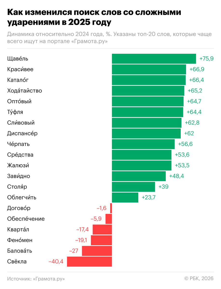 Россияне стали чаще искать, как ставятся ударения в словах «щавель», «красивее» и «каталог». Реже — «свекла», «баловать» и «феномен». Это следует из данных портала Грамота.ру (есть у РБК). Запросы слова «щавель» выросли на 75,9%, красивее — на 66,9%, каталог — на 66,4%. Запросы ударений в слове «свекла» упали на 40,4%, «баловать» на 27%, «феномен» — на 19,1%. Нравится РБК? Главные новости дня, эксклюзивы и аналитика ждут вас: