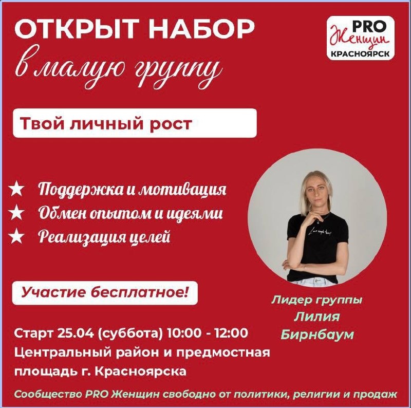 » 💚 Меня зовут Лилия Бирнбаум, я: 🥱 Лидер малых групп сообщества PRO Женщин 😴 Предприниматель 🤤 Практик бережного взаимодействия с телом, состоянием и честного разговора 😪 В процессе глубокого изучения человека, его ресурсов и возможностей Все мы мечтаем — и это так важно. Я приглашаю тебя не откладывать, а начать делать свою мечту реальностью. Вместе мы определим цель, наметим понятный путь и будем двигаться в поддерживающем круге где можно быть собой, сомневаться и всё равно идти Здесь нет “правильных” и “неправильных” целей, есть только твоя —та, от которой загораются глаза и внутри появляется жизнь Если ты чувствуешь, что пришло время реализовывать своё, но не хочешь идти в этом одна — приходи ❤️ Эта группа для женщин, которые: ▫️ хотят расти, но без насилия над собой ▫️ готовы честно посмотреть на свои желания ▫️ ищут опору в себе и поддержку в других ▫️ не только мечтают, но и реализовывают свои мечты Если ты чувствуешь отклик — значит тебе сюда🫣 Готова присоедин