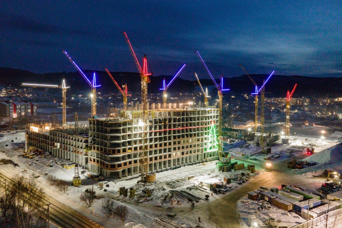 (не проверяли, но уверены в этом на 100%) Говорят, самые масштабные проекты всегда заметны издалека. В Белокурихе — именно такой случай. Стройплощадка RIZALTA в центре города стала стала самой необычной и обсуждаемой в регионе. В канун Нового года один из крановщиков украсил стрелы кранов гирляндами — так они начали светиться в темноте. После праздников иллюминацию решили не убирать. Краны продолжают светиться, а сама площадка хорошо просматривается из разных точек города и остаётся заметной для гостей и жителей. При этом за визуальным эффектом — реальные темпы. На площадке одновременно работает более 10 кранов, задействованы многочисленные бригады и техника. Менее чем за год почти завершён первый корпус, параллельно ведутся работы ещё по трём. RIZALTA — проект, который привлекает внимание и масштабом, и скоростью реализации.