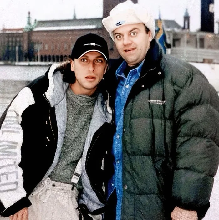 Ого, какие лица! Это же молодые Дмитрий Нагиев и Алексей Климушкин, который позже станет нашим любимым Сильвестром Андреевичем, где-то в Стокгольме в 90-е годы. Такие свежие, полные энергии, тогда они только начинали свой путь к большой известности, но уже чувствовалось, что это очень яркие и харизматичные парни. Нагиев тогда был на пике популярности в Питере, а Климушкин – его верный соратник.