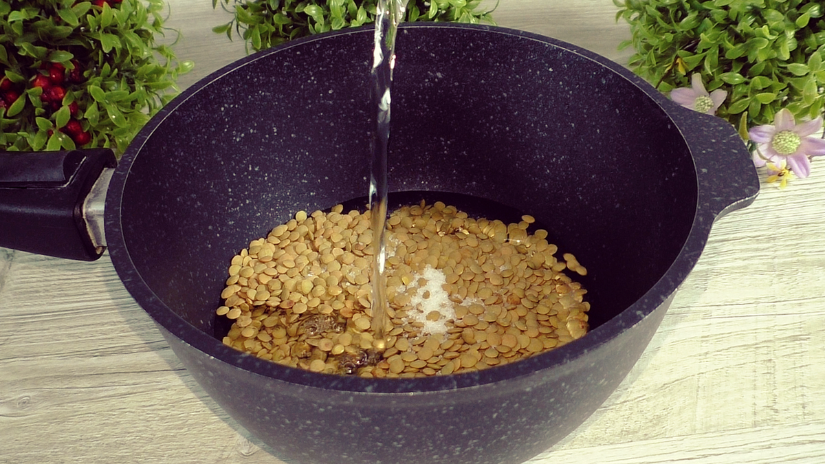 Начинаем приготовление с чечевицы: её надо промыть и отправить в кастрюлю.