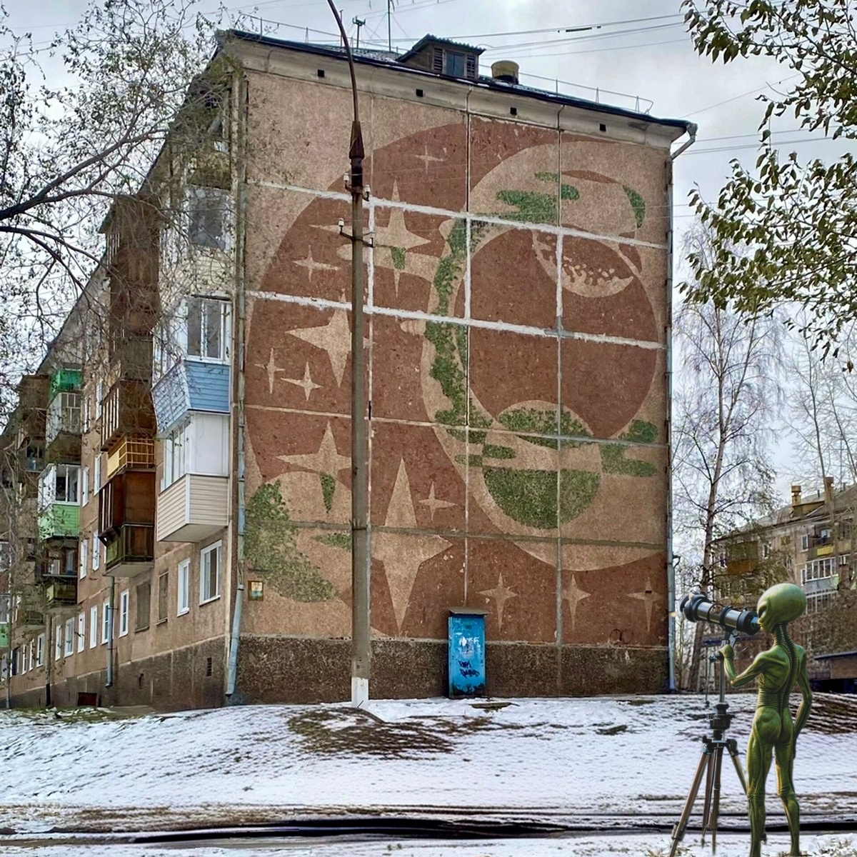 Торцы трех пятиэтажек на бульваре Космонавтов представляют собой гигантские цветные панно, изображающие завоевание космоса человеком. Они изготовлены по эскизам братских художников. «Икар» – так называется одна из композиций на торце многоэтажного дома. Во всю его высоту изображен летящий человек на фоне земли и других планет Солнечной системы. Второе здание украсила композиция «Звёздная дорога», третье – «Земля-мать» (Космонавтов, 14). Женщина, олицетворяющая Землю-мать, посылает своего сына к другим планетам. На заднем плане – космический корабль.