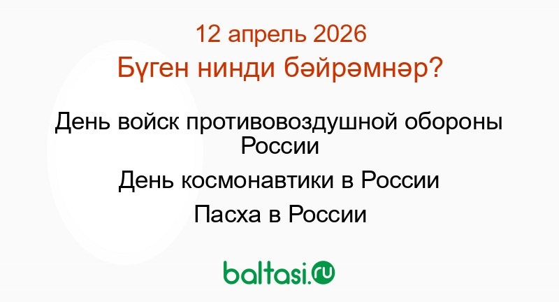 • День войск противовоздушной обороны России День войск противовоздушной обороны (День войск ПВО) является памятным днём в Вооруженных Силах России и отмечается ежегодно во второе воскресенье апреля согласно Указу Президента РФ № 549 от 31 мая 2006 года «Об установлении профессиональных праздников и памятных дней в Вооруженных Силах Российской Федерации». • День космонавтики в России 12 апреля в России отмечают важную памятную дату — День космонавтики — в ознаменование первого космического полета, совершенного Юрием Гагариным . • Пасха в России Светлый праздник воскресения Христа — Пасха — пришел из Византии вместе с крещением Руси в конце 9 века. С тех пор по всей России широко и торжественно отмечают этот христианский праздник. Подписаться: 📌 VK: vk.com/baltasi 📌 Max: max.ru/baltasi