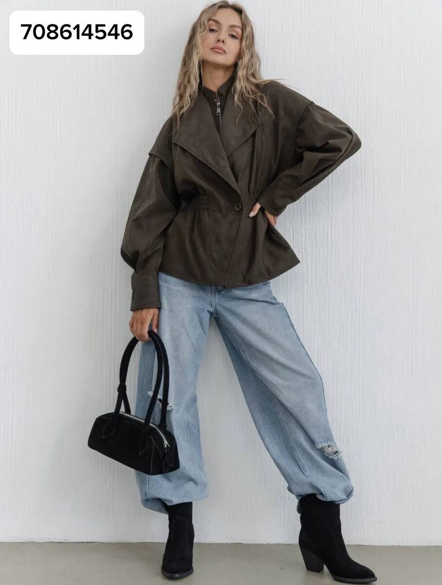 Сама форма куртки заслуживает отдельного внимания. У нее свободный силуэт, который не обтягивает фигуру, а формирует нужный объем. За счет этого вещь выглядит расслабленно, модно и дорого. Линия плеча слегка смягчена, но при этом сохраняет выразительность. Такой крой делает образ более статусным и актуальным. Куртка не смотрится слишком грубо, как это иногда бывает с плотной кожей, а наоборот — выглядит пластично, женственно и очень современно.