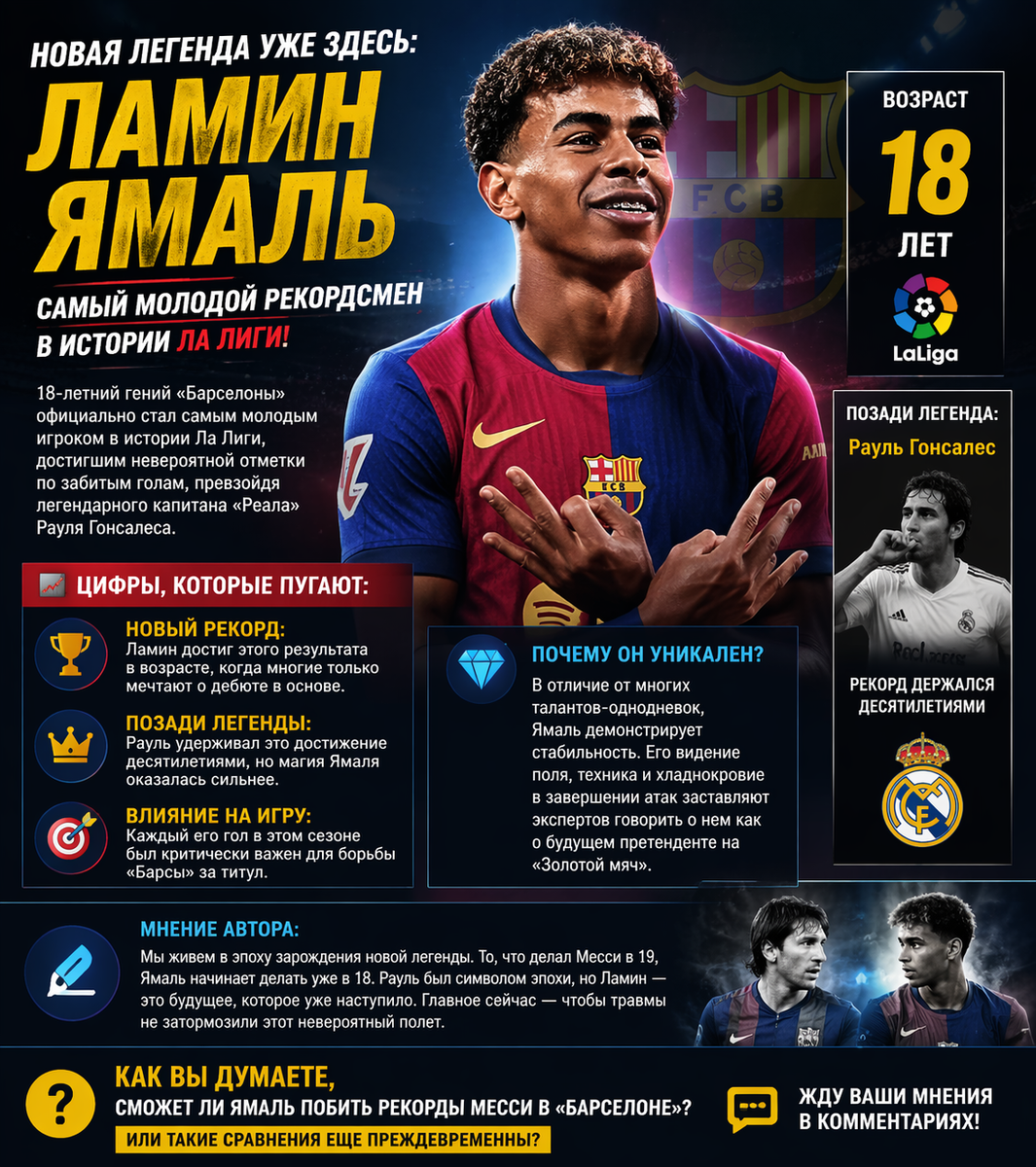 Пока весь мир обсуждает травмы и судейские скандалы, 18-летний гений «Барселоны» продолжает переписывать историю футбола. Ламин Ямаль официально стал самым молодым игроком в истории Ла Лиги, достигшим невероятной отметки по забитым голам, превзойдя легендарного капитана «Реала» Рауля Гонсалеса.