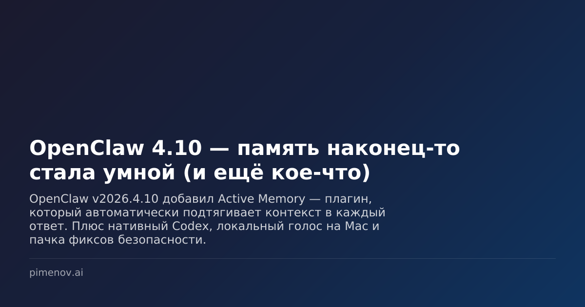 OpenClaw v2026.4.10 добавил Active Memory — плагин, который автоматически подтягивает контекст в каждый ответ. Плюс нативный Codex, локальный голос на Mac и пачка фиксов безопасности. Если вы работаете с OpenClaw, то знаете главную боль: агент забывает. Вы ему объясняете, как вам нравится — а через три сообщения он снова на нуле. Команда remember this помогала, но это костыль: нужно вручную говорить, что запомнить. В версии 4.10 это наконец починили. Главное нововведение — Active Memory plugin. Это отдельный мини-агент, который запускается перед каждым ответом и сам подтягивает из памяти всё релевантное: ваши предпочтения, контекст прошлых разговоров, важные детали. Без вашего участия. Настраивается через конфиг, есть режим /verbose для отладки. Документация уже на месте. Codex стал нативным провайдером. Модели codex/gpt-* теперь работают через собственную авторизацию, с тредами и компакшеном — отдельно от обычного пути openai/gpt-*. Если вы подключали Codex через обходные пути — тепер