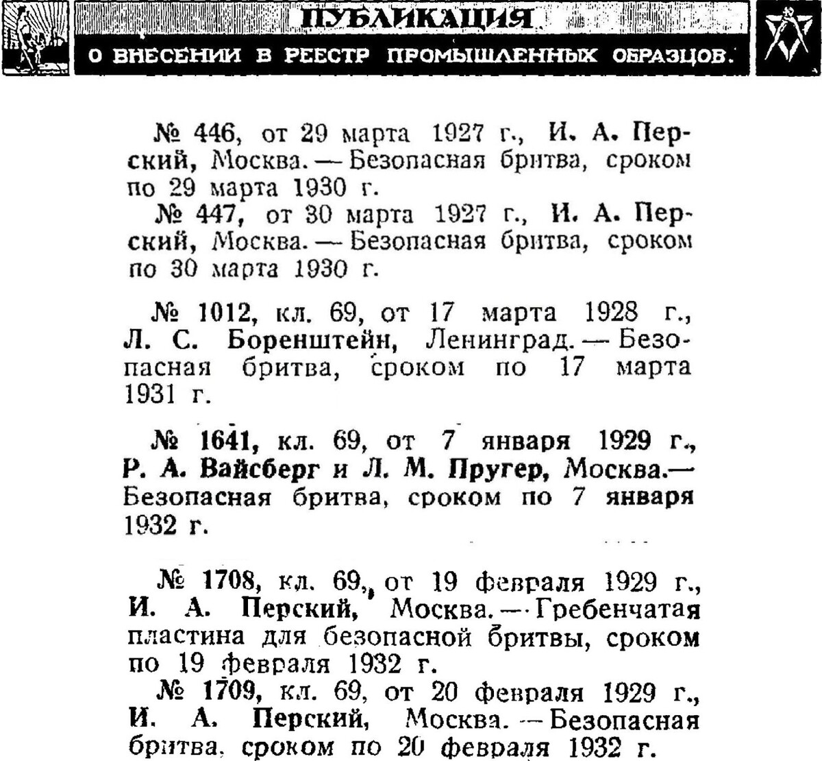 Предыдущая публикация "Нэпманы-изобретатели бритв" была подвергнута критике со стороны давнишнего коллеги Антона, эксперта ресурса "Бритва.ру". Он посетовал на неполноту материала в части игнорирования мной зарегистрированного под номером 1641 промышленного образца безопасной бритвы изобретателей Вайсберга и Прудера. Сейчас я изложу свои соображения по этому поводу, но прежде хочу ознакомить читателей со списком изобретателей безопасных бритв за все годы НЭП, которые тоже не были упомянуты в предыдущей публикации. Теперь о бритве Вайсберга и Прудера, промышленный образец № 1641. Что мы имеем? Имеем три складных бритвы "Ideal Gillette" c дополнительной отштампованной надписью "O.S.1641". Промышленному образцу бритвы Вайсберга и Прудера присвоен тоже номер 1641. Дополнительно в справочнике "Абоненты МГТС" на 1930 год есть упоминание о промыслово-кооперативном товариществе, производителе безопасных бритв с уже знакомым названием. Можно ли из этих двух совпадений сделать вывод, что бритвы