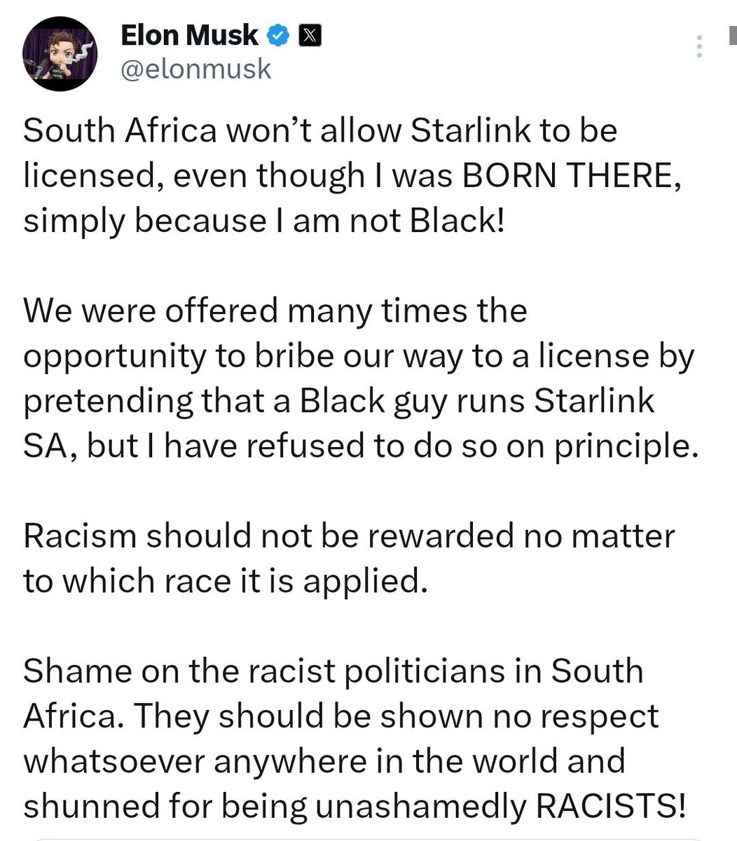 Elon accuses South Africa of denying Starlink license 'because I am not BLACK