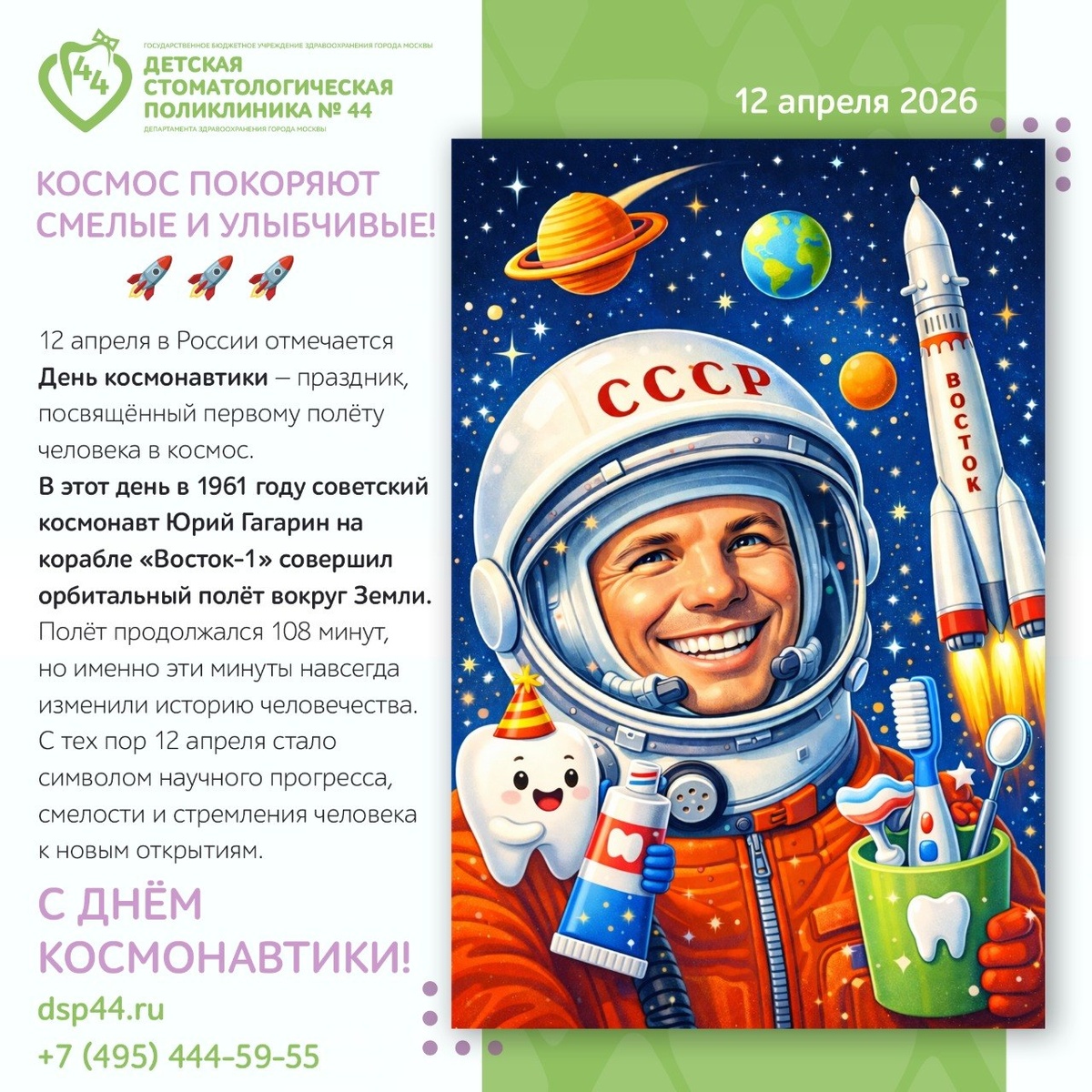 🤩 12 апреля в России отмечается День космонавтики — праздник, посвящённый первому полёту человека в космос. В этот день в 1961 году советский космонавт Юрий Гагарин на корабле «Восток-1» совершил орбитальный полёт вокруг Земли. Полёт продолжался 108 минут, но именно эти минуты навсегда изменили историю человечества. С тех пор 12 апреля стало символом научного прогресса, смелости и стремления человека к новым открытиям. 🌍 Праздник отмечают не только в России В разных странах мира этот день известен как: День космонавтики — в России и странах постсоветского пространства International Day of Human Space Flight — официальный международный день, учреждённый Организацией Объединённых Наций Yuri’s Night — популярный международный праздник космоса, который отмечают в более чем 60 странах мира В этот день проходят научные лекции, выставки, образовательные мероприятия для детей и взрослых, а также тематические встречи, посвящённые космосу и развитию науки. ⭐️ Интересный факт о первом пол