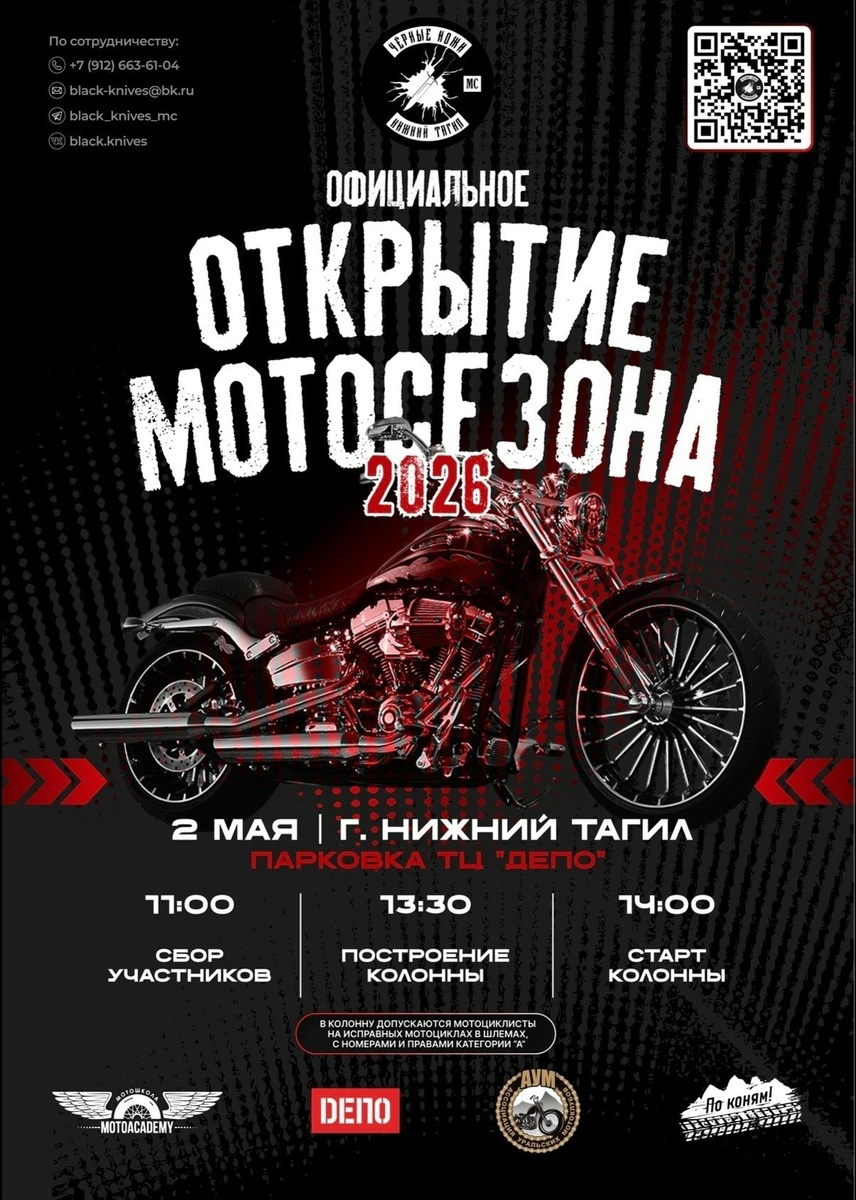 ™: https://vk.com/wall-235498912_19 Открываем мотосезон вместе! 🏍🔥 2 мая 2026 года мотоклуб «Чёрные ножи» проведёт официальное открытие мотосезона в Нижнем Тагиле! Вас ждёт насыщенная и по-настоящему драйвовая программа: зрелищный мотопробег по городу, выступления музыкантов, развлекательная программа с конкурсами и подарками от партнёров, а также яркое мотошоу. Локация- площадка у ТЦ «Депо» (Свердловское шоссе, 31Б) — отличное место, чтобы встретиться, хорошо провести время и зарядиться настроением. Это не просто праздник, а ещё и важный повод напомнить всем участникам движения о начале мотосезона, внимательности на дорогах и взаимном уважении. Присоединяйтесь, будет громко, ярко и незабываемо! Автор: https://vk.ru/lehrmann