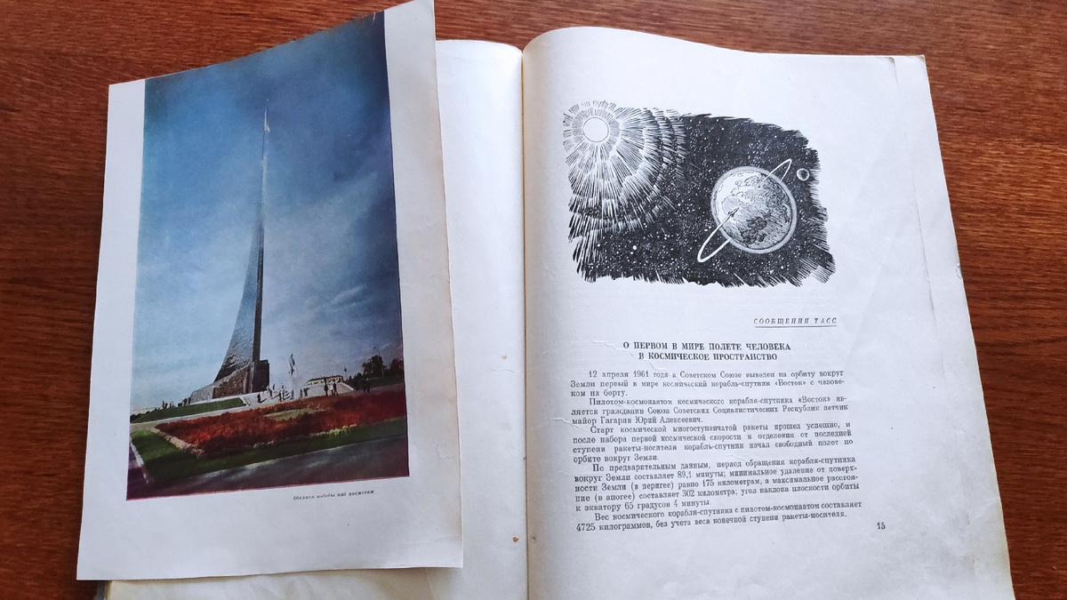 Это развороты здоровенной тяжеленной книги "Утро космической эры" 1961 года издания. Уже в школьные годы ее, потрепанную и списанную из библиотеки, принесла домой мама.