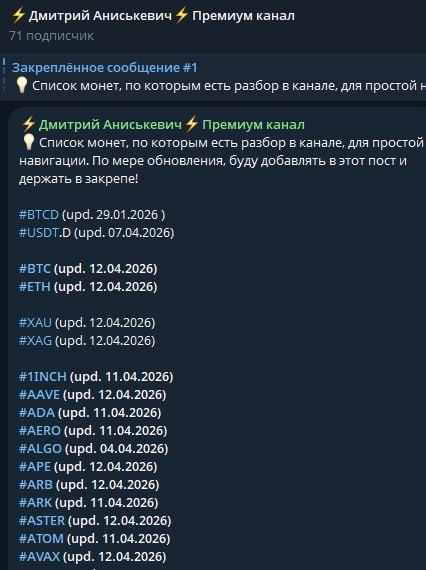 ! Всего более 60 активов в постоянном обновлении. Я начал большую работу по обновлению списка монет в Премиум канале. Поэтому, если вам нужна качественная навигация по рынку, то вам к нам. Для доступа пишите @anis_manager Стоимость подписки 1 месяц 50 USDT, 3 месяца - 135 USDT