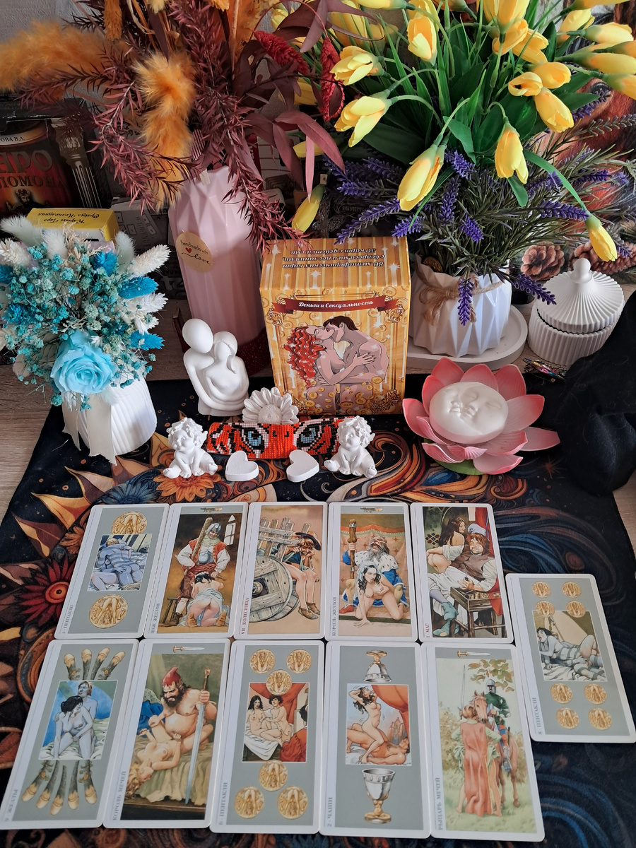 Это очень интересный расклад на колоде «Декамерон», которая специально создана для исследования любовных и эротических тем. Карты показывают, что фантазии мужчины довольно многогранны: от игривых и спонтанных до властных и техничных. Он явно хочет разнообразия и готов учиться.