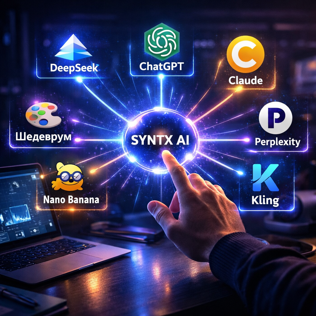 Я пользуюсь Syntx AI — это платформа, где собраны все эти модели в одном окне. Переключаюсь между DeepSeek, ChatGPT, Claude, Kling, Nano Banana — всё в одном интерфейсе, все чаты сохраняются, не надо запоминать 10 паролей.