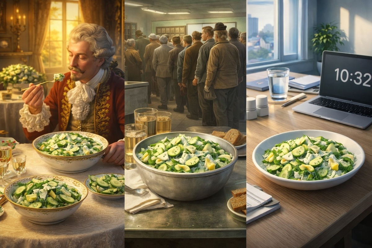 Знаете, что общего между советской столовой, французским графом и вашим холодильником прямо сейчас? Сегодня я расскажу историю блюда, которое когда-то подавали к царскому столу, потом оно стало символом домашнего уюта в каждой советской семье, а сегодня о нём незаслуженно забыли. Готовьте блокноты — этот рецепт снова войдёт в моду, и вы будете в первых рядах. 😎 Поехали! 🚀 Всё началось в конце XIX века. Французский граф (по одной из версий — Люсьен Оливье, но нет, это не он) путешествовал по России и был приглашён на обед в купеческий особняк. Подали простое, но невероятно гармоничное блюдо: нарезанные овощи, яйца, немного сметаны и секретная заправка. Граф пришёл в восторг и увёз рецепт в Париж. В советское время этот салат пережил второе рождение. Он был идеален: продукты доступные, готовка быстрая, а выглядит — как в ресторане. Его подавали и на новогодних столах, и на скорую руку, когда неожиданно приходили гости. Но в 90-е о нём почти забыли — нахлынули оливье, селёдка под шубой,