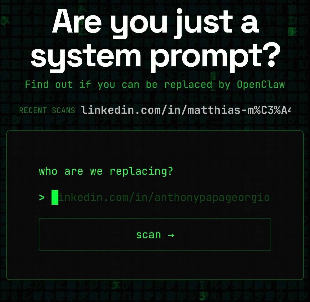 Даём ссылку на ваш профессиональный профиль — резюме, LinkedIn, то, где указаны ваши способности. Далее получаем «процент заменяемости» и .md-файл со своим цифровым клоном. Пугаем себя на выходные — тут.