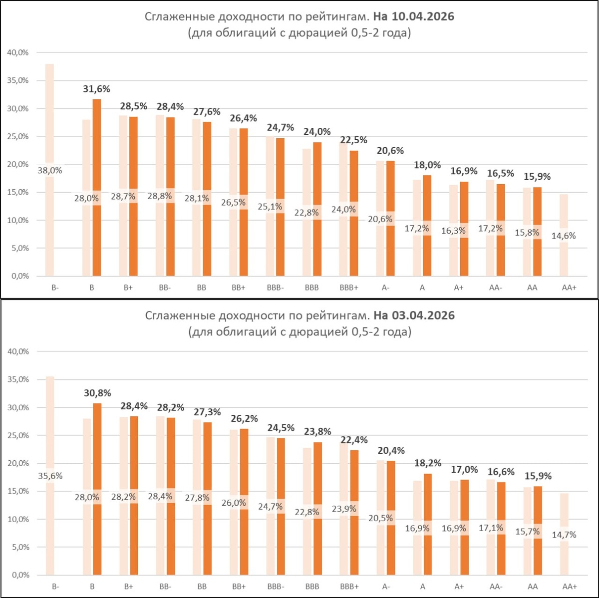 Средние доходности облигаций в зависимости от рейтинга (бледные столбцы — доходности без сглаживания). И как они изменились за неделю. Мартовское снижение ключевой ставки никак не доберется до ВДО. Доберется ли апрельское? Телеграм: @AndreyHohrin