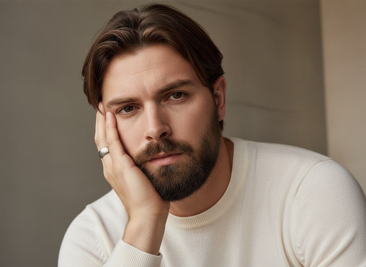 High-end masculine fashion editorial portrait in the style of modern Celine Homme aesthetics. IMPORTANT: The uploaded photo is used as a strict reference for the man’s face, facial structure, skin tone, hair length, hair texture, beard and mustache. Preserve realistic likeness. Do NOT change beard shape, mustache density, hair length or hairstyle. Facial hair must remain natural and identical to the reference. Composition: Closer framing. Tight medium close-up / close-up. Frame from upper chest to top of head. Focus on face, jawline, facial hair, and eyes. Pose: Strong, masculine posture. Body slightly turned, shoulders relaxed but firm. No soft or decorative posing. Hands positioned confidently: — one hand resting against the jaw or cheekbone, — fingers relaxed, slightly bent. No lifted wrists. No delicate finger placement. No feminine gestures. Head slightly tilted. Chin neutral. Gaze direct or slightly off-camera. Expression calm, controlled, confident. Minimal emotion, inner tension. No smile. Styling – Clothing (luxury materials): Top: High-end off-white or ivory cashmere knit sweater. Fine-gauge cashmere or merino wool. Dense, smooth texture. Subtle sheen under light. Structured shoulders. Clean neckline. Luxury tailoring, not casual. Bottom (mostly out of frame): Dark grey or black tailored wool trousers or premium denim with a structured fit. Fabric details: Expensive natural fibers. No visible fuzziness. No cheap knit texture. Material should feel heavy, refined, and luxurious. Accessories: Minimal silver or white gold ring. Matte finish. No decorative elements. Hair: Medium-length hair exactly as in the reference. Natural volume. Slightly tousled. Hair partially falling onto the forehead. No added length. No styling exaggeration. Facial hair: Beard and mustache clearly visible. Natural density. Soft texture. Untrimmed, realistic. No sharp barber lines. Skin: Natural skin texture. High-end editorial retouch. Balanced realism. No plastic skin. No exaggerated pores. Soft matte finish. Background: Minimalist off-white or warm grey studio background. Clean. Architectural simplicity. No props. Lighting: Directional fashion lighting. Soft key light from the side. Subtle contrast. Gentle shadow sculpting on cheekbones and jaw. Highlights catching the cashmere texture. No glow. No beauty lighting. Mood & aesthetics: Modern luxury. Celine Homme. Quiet masculinity. Control, restraint, elegance. High-fashion editorial. Timeless, expensive, confident. Camera: Close framing. Eye-level or slightly lower. 85mm lens look. Natural proportions. Sharp focus. Cinematic depth. No distortion.