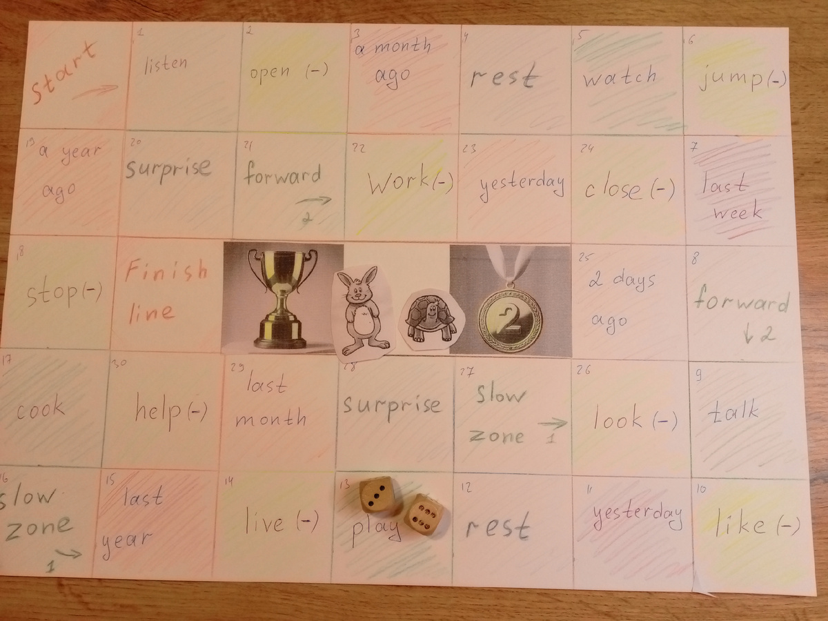 Недавно с учениками четвёртого класса изучали употребление правильных глаголов в прошедшем простом времени (Past Simple). Для отработки материала я решила сделать настольную игру. За основу взяла сказку "Быстрый Заяц и медленная Черепаха" (мы как раз прошли её по учебнику Spotlight). В этой статье рассказываю, как происходил процесс создания. 1. Лист А3 разделила на квадраты со стороной 6 см. Пронумеровала клетки (30). 2. Подписала клетки старт (Start) и финиш (Finish line), отдых (rest), вперед на 2 клетки (forward), назад на одну клетку (slow zone), сюрприз (surprise). 3. На синих клетках написала правильные глаголы (например, listen, watch, talk,play, cook). 4. На жёлтых клетках написала правильные глаголы со знаком минус, то есть детям нужно назвать это действие в отрицательной форме (didn't open, jump, like, live, stop, work, close, look, help). 5. На красных клетках написала указатели времени (a month ago, last week, yesterday, last year, 2 days ago и тд). Детям надо составить п